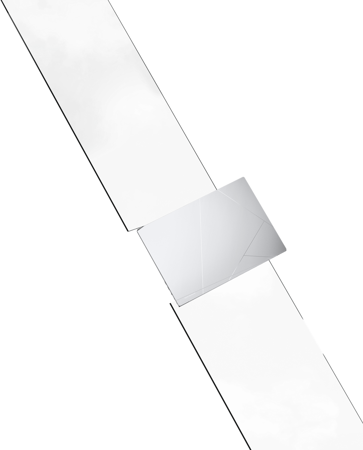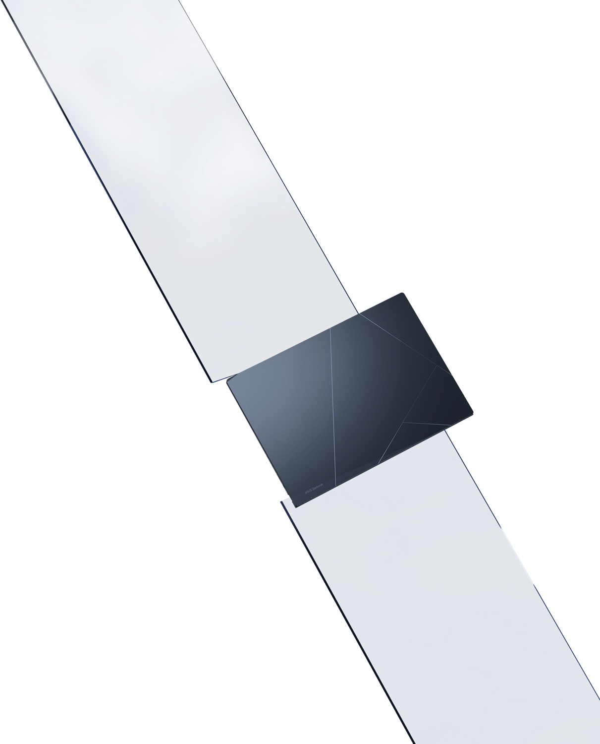 Un Zenbook 14 OLED Ponder Blue et Foggy Silver placé dans un open space blanc beige avec des lumières et des ombres.